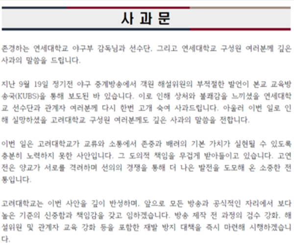 고려대학교가 지난 9월 열린 2025년 정기 고연전 친선경기대회 야구 중계 과정에서 발생한 부적절한 발언 논란과 관련해 연세대에 공식 사과했다고 29일 밝혔다. 연세대는 이를 수용하며 이번 사안을 계기로 양교가 함께 정기전 문화를 더욱 성숙하게 발전시켜 나가겠다는 의지를 밝혔다. (▶자세히보기)