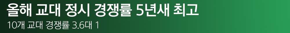 서울 지역 대학 경쟁률은 2022학년도 6.12대 1, 2023학년도 5.82대 1, 2024학년도 5.80대 1, 2025학년도 6.04대 1로 집계됐다. 지역 대학 정시 경쟁률은 2022학년도 3.35대 1, 2023학년도 3.60대 1, 2024학년도 3.70대 1, 2025학년도 4.20대 1로 올해는 최근 5년 새 최고치를 기록했다. |