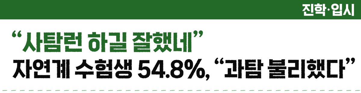 14일 진학사가 2026학년도 정시 지원 수험생 1649명을 대상으로 조사한 결과, 고교 이수과목 기준 자연계열 수험생 980명 가운데 과탐 2과목을 응시한 수험생의 54.8%가 “탐구 선택이 정시 지원에서 불리하게 작용했다”고 답했다. 자연계열임에도 사탐 2과목을 선택한 수험생은 47.6%가 “유리하게 작용했다”고 응답해 뚜렷한 대조를 보였다.