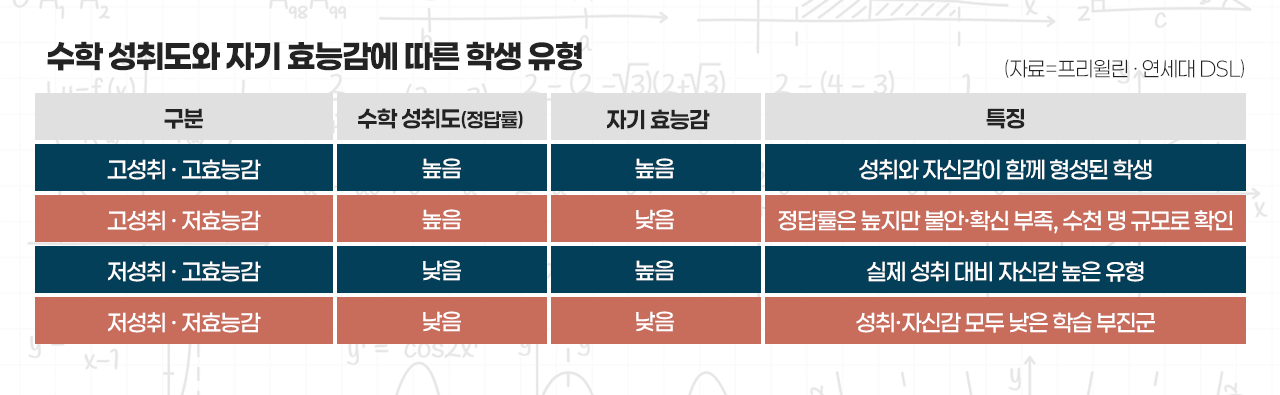 한국 학생들에게 수학은 대학이라는 산을 넘기 위해 반드시 '정복'해야 하는 과목으로 꼽힌다. 그러나 성적과 달리, 수학에 대한 자신감을 갖는 학생은 드물다. 에듀플러스는 프리윌린의 최근 2년간 전국 단위 초·중·고 수학 학습 데이터를 바탕으로, 연세대 데이터사이언스 학회(Data Science Lab·DSL)와 함께 '수학 성취도와 자기 효능감'을 분석했다. 그 결과 수학 성취도가 높아도, 수학을 못 한다고 느끼는 학생들이 존재하는 것으로 나타났다.