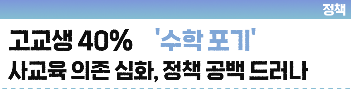 수학 사교육 의존이 심화되고 '수포자' 비율이 고등학생의 40%에 육박하는 것으로 나타났다. 이에 국회와 시민단체가 공교육 정상화를 위한 국가 차원의 종합 대책 마련을 촉구하고 나섰다. 특히 수학 학습 부진이 고등학생을 중심으로 전반적인 현상으로 확산하고 있다는 지적이 나온다.