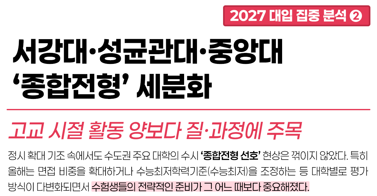 2027학년도 대입에서는 수시 비중이 처음으로 80%를 넘겼다. 수시에서 가장 큰 비중을 차지하는 것은 학생부교과전형(교과전형)이지만, 수도권 대학에서는 여전히 학생부종합전형(종합전형)이 우세하다. 2027학년도 수도권 지역 종합전형 선발인원은 3만9062명으로 전체 수시 전형의 29%를 차지한다. 2026학년도 3만8670명(28.9%) 보다 392명 늘어난 수치다.