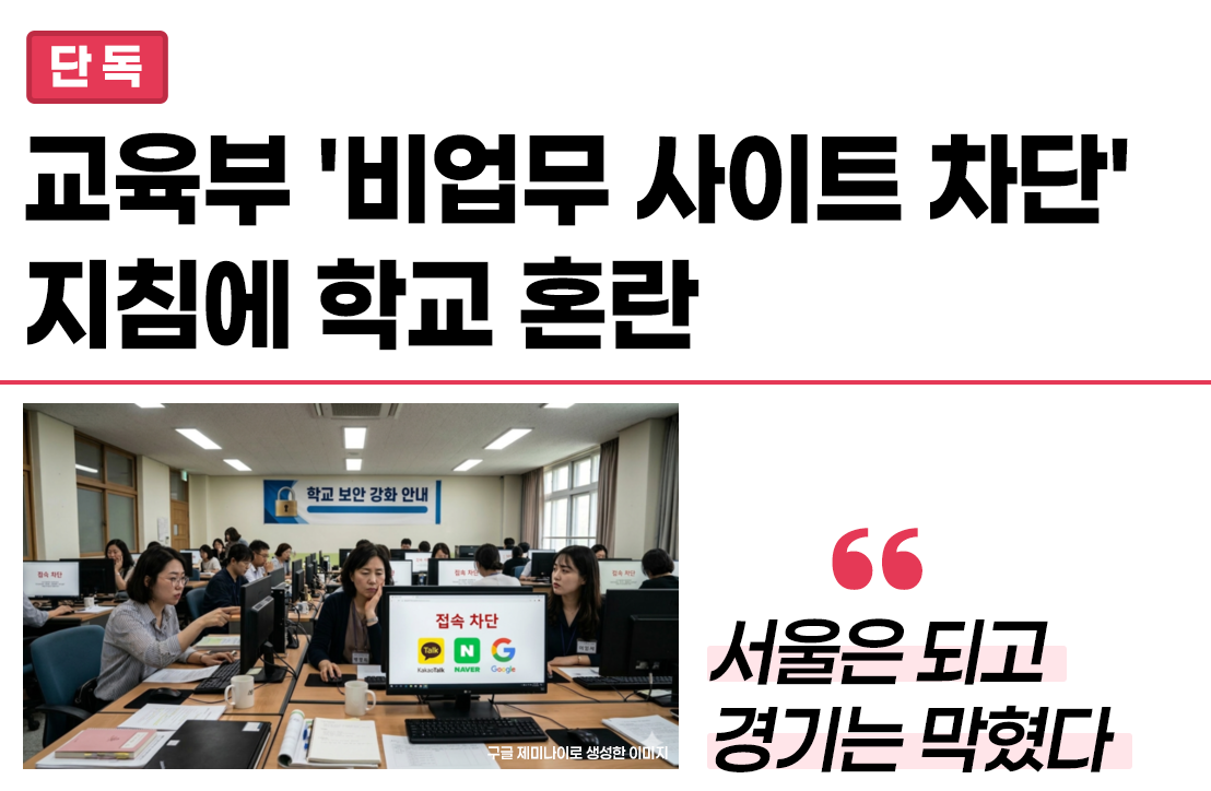 교육부와 교육청의 '비업무 사이트 접속 정책'으로 새 학기 학교 현장에서 혼란이 빚어졌다. 같은 교육부 지침인데도 서울에서는 카카오톡 등 외부 사이트 접속이 가능했던 반면, 경기도에서는 접속이 차단되며 업무에 차질이 발생했다.