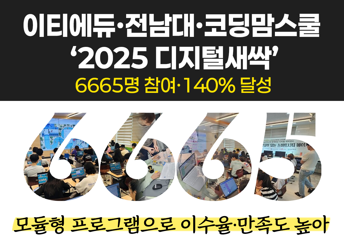 이티에듀·전남대·코딩맘스쿨 컨소시엄이 '2025년도 디지털새싹'을 통해 6665명의 초·중·고 학생에게 인공지능(AI)·디지털 교육을 제공했다. 당초 목표인 4800명보다 1865명 많은 138.9% 초과 달성한 규모다. 이수 학생 6335명, 이수율 95%로 학생들의 실질적 디지털 역량을 향상시켰다. 이티에듀 컨소시엄만의 차별점인 '모듈형 프로그램' 기반으로 학생 수준·선호별 맞춤형 교육이 가능했기 때문이다.