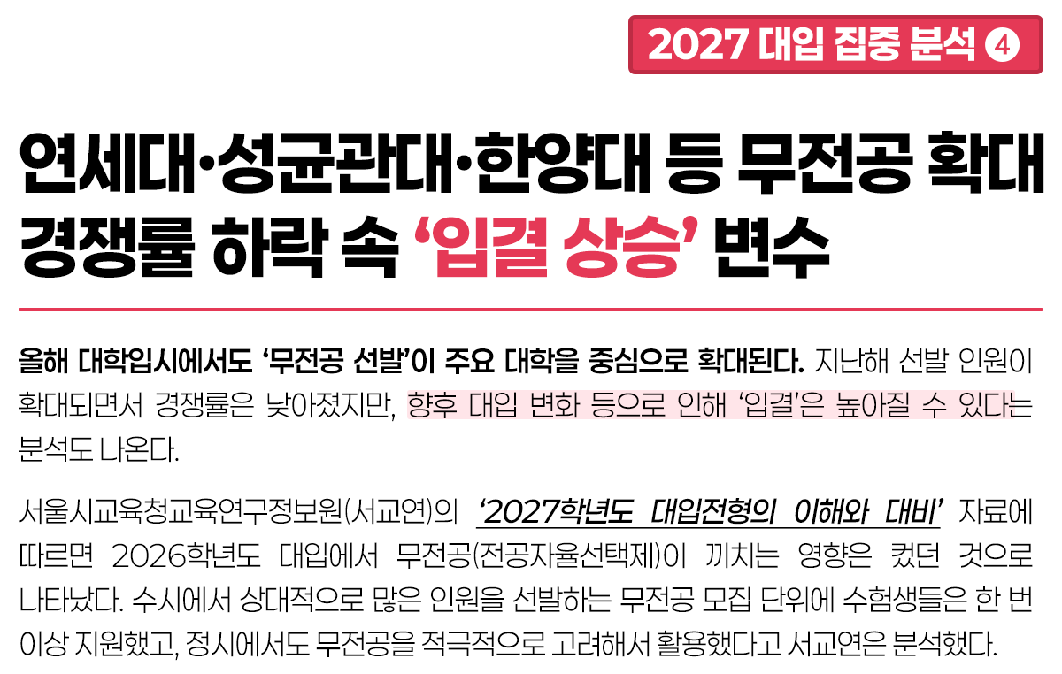 2027학년도 대입에서 수도권 대학 무전공 선발 인원은 1만2943명(25.7%)이다. 정시 선발 인원도 1만2647명(25.1%)으로 수시와 비슷한 규모로 선발한다. 반면 비수도권 대학은 수시 선발 비율이 2만1923명(43.5%)으로 정시 선발 인원인 2865명(5.7%)에 비해 압도적으로 많다.