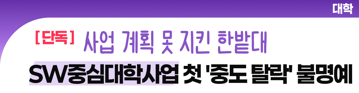 지난해 사업 10주년을 맞이한 소프트웨어(SW)중심대학사업에 선정됐던 국립한밭대가 중도 탈락한 것으로 확인됐다. 2016년 사업이 시행된 이후 첫 사례로, 그동안 한 번도 탈락한 대학이 없었던 만큼 다른 대학도 사업 관리와 성과 평가에 촉각을 곤두세우는 분위기다.
