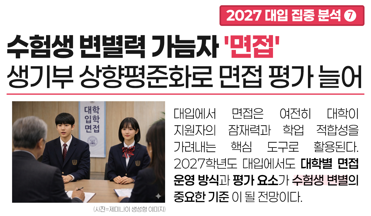 서교연 관계자는 “이는 대학이 서류 기재 내용의 진위를 면접을 통해 검증하고자 하는 요구가 늘어나고 있다는 것을 보여준다”며 “1단계 합격자들의 서류 점수 차이가 크지 않기 때문에 면접은 최종 합격을 결정짓는 중요한 변수”라고 밝혔다.