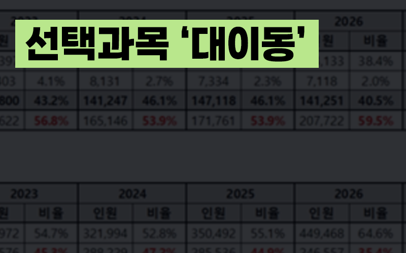 10일 이투스에듀가 분석한 자료에 따르면 2027학년도 3월 학평 사회·문화 응시 인원은 전년도보다 2만7377명 증가한 17만8202명이었고, 생활과 윤리 응시 인원은 2만153명 증가한 15만6656명이다. 국어는 화법과 작문, 수학은 확률과 통계로 쏠림 현상이 심화해 언어와 매체, 미적분 응시 인원은 채 30%가 되지 않았다.